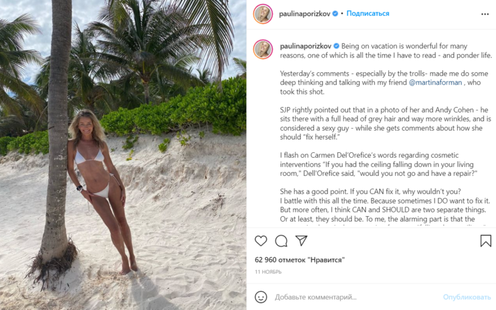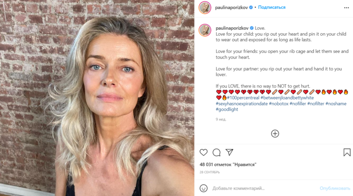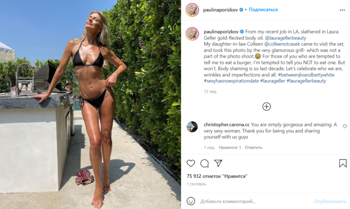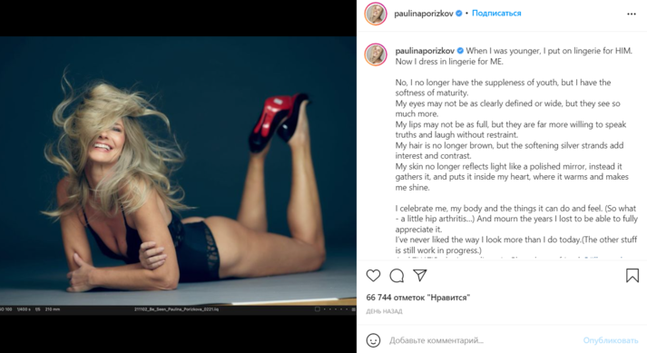 На размещенном в сети снимке 56-летняя знаменитость запечатлена с распущенными волосами в черном кружевном боди с глубоким декольте и туфлях на каблуках такого же цвета. Поризкова снялась полулежа лицом к фотографу. «Когда я была моложе, я надевала красивое белье для него. Теперь я одеваюсь так для себя. (...) Я никогда не любила свое тело так, как сейчас», — подписала она пост, который набрал почти 60 тысяч лайков.