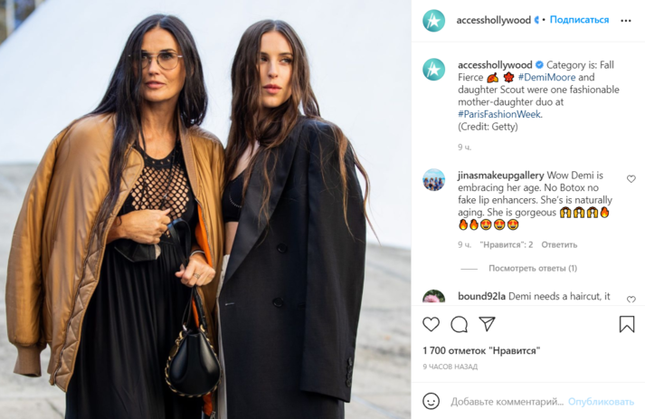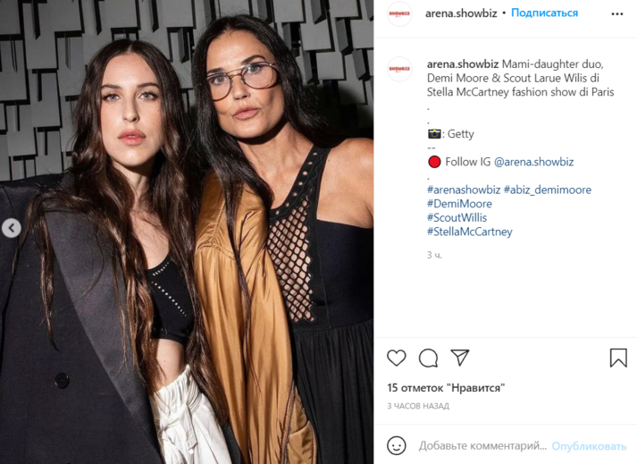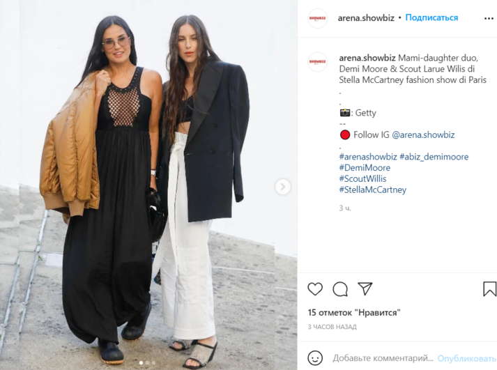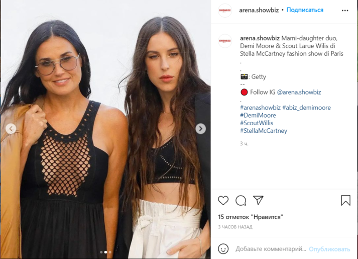 Мур и ее дочь выглядели как подруги, они с радостью позировали фотографам перед началом показа дочери известного музыканта Пола Маккартни. Деми и Скаут распустили темные волосы и стали еще больше похожи друг на друга.