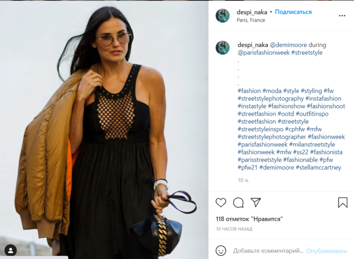 58-летняя американская актриса Деми Мур в сетчатом комбинезоне без бюстгальтера появилась на показе Стеллы Маккартни в Париже.
