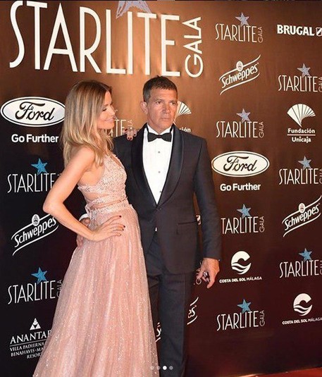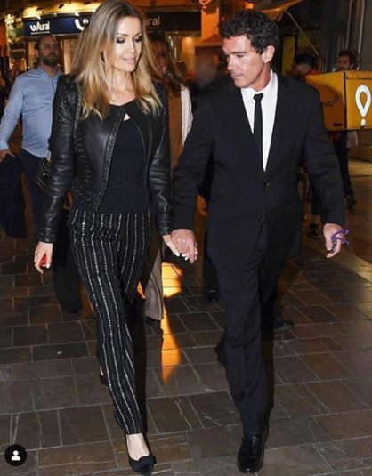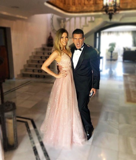 На красной дорожке Бандерас появился в традиционном смокинге с бабочкой и светился от щастья рядом с обворожительной возлюбленной в пышном розовом платье с глубоким декольте.