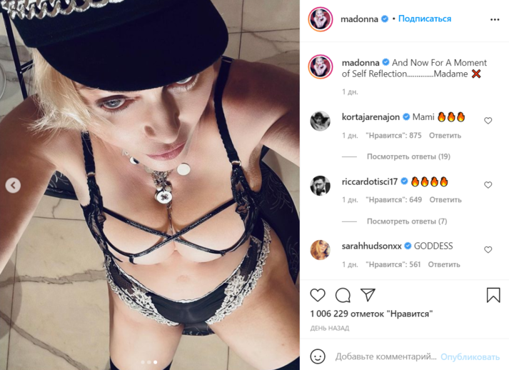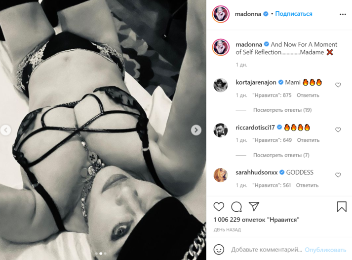 В то же время другие подписчики встали на защиту Мадонны и принялись писать ей комплименты. «Ты просто богиня», «Выглядишь потрясающе», «Ты вообще не стареешь», «Горячая», «Обожаю тебя», «Разве возможно выглядеть так в твоем возрасте?», «Просто вау», — высказывались пользователи.