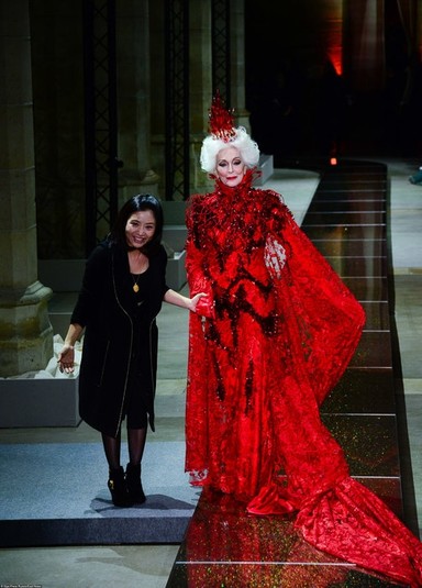 Ну, а китайский дизайнер Гуо Пей за идеей в карман не полезет: на финальный выход в своем шоу haute couture, состоявшемся в минувшую среду в Париже, она пригласила известную возрастную модель Кармен Делль' Орефиче.