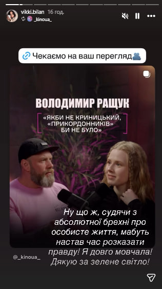 «Ну що ж, судячи з абсолютної брехні, мабуть, настав час розповісти правду! Я довго мовчала! Дякую за зелене світло!» – написала Вікторія Білан-Ращук.