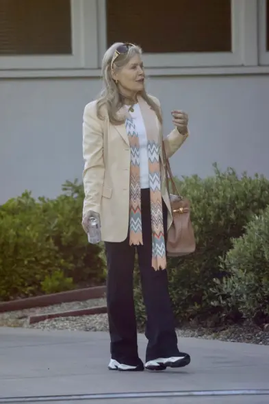 Водночас Беверлі Д'Анджело була одягнута у бежеве пальто, штани, кросівки, а з аксесуарів вона обрала сумку, шарф та також сонцезахисні окуляри.