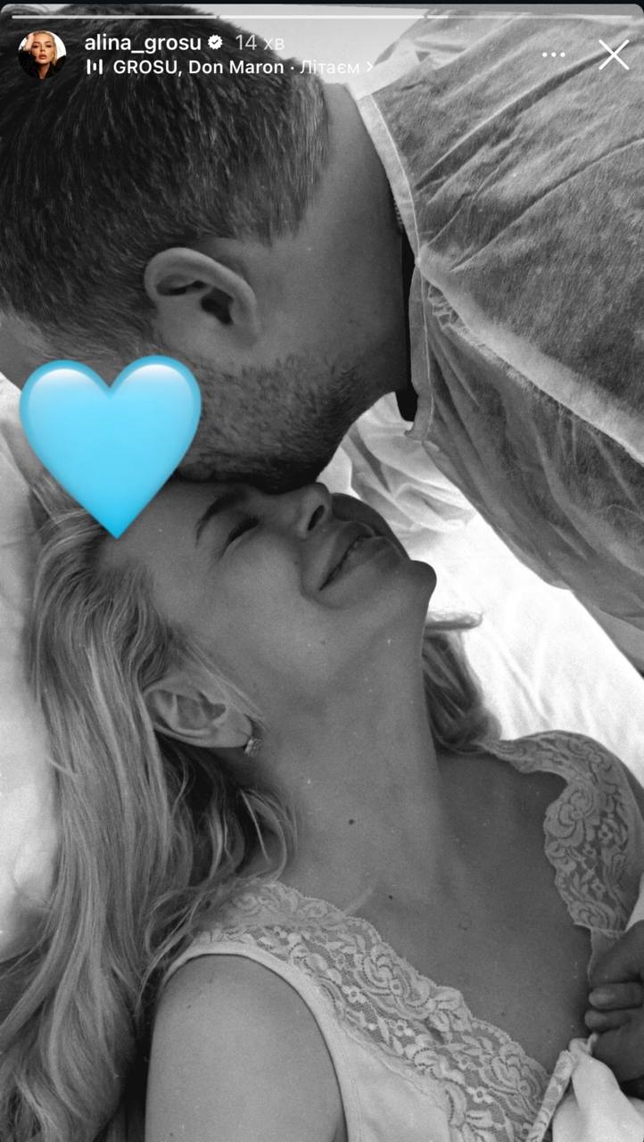 Також у сторис артистка поділилася світлиною з пологового, де вона тримає на руках свого первістка, а чоловік цілує її у чоло.