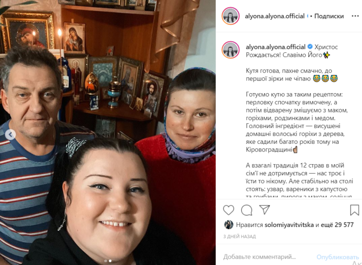 Популярная украинская рэперша alyona alyona показала своих родителей. В своем Инстаграме звезда опубликовала милую семейную фотографию. На рождественском снимке исполнительница позирует на фоне икон вместе с мамой и папой.