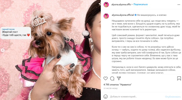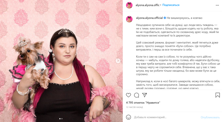 Знаменитая украинская рэперша alyona alyona в своем Инстаграме подумала о том, как важно оставаться собой. На странице в Instagram звезда разместила фотографию, где предстала в образе гламурной девочки с собачкой на руках. По мнению Алены Савраненко, нужно избавляться от убеждений времен СССР и не стесняться себя настоящего.