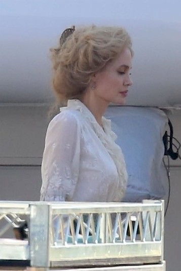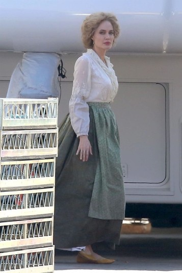 Наряд в силе начала 20 века ей тоже очень к лицу. Белая воздушкая блуза, длинная зеленая юбка с перламутровыми бликами, винтажные серьги и светло-коричневые балетки — Анджелина будто создана для того времени! Правда жаль, что ретро-прическа звезды — это всего лишь парик.
