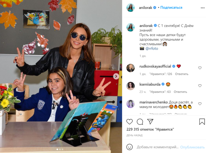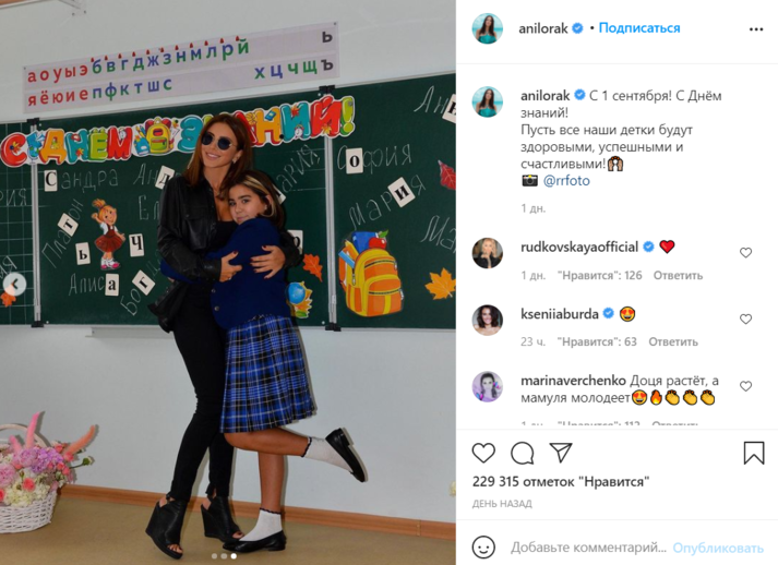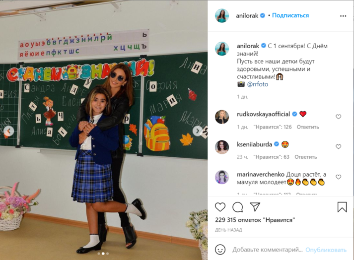 Проживающая в России украинская певица Ани Лорак отвела свою дочь Софию в российскую школу. Артистка опубликовала в своем Инстаграме снимки с торжественной линейки.