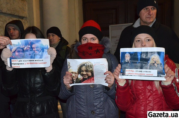 Около сотни представителей националистических организаций собрались перед львовской оперой, в которой планировался концерт, и устроили «коридор позора». Протестующие держали в руках фото Билык с названиями городов Донбасса, в которых проходили боевые действия, а также разлили перед входом театр свиную кровь, бросив в нее две розы. Этим самым активисты не позволяли зрителям войти в оперный театр.