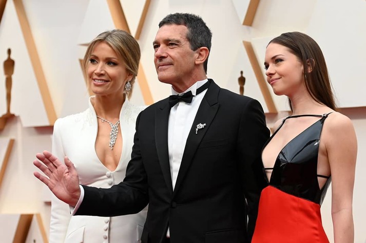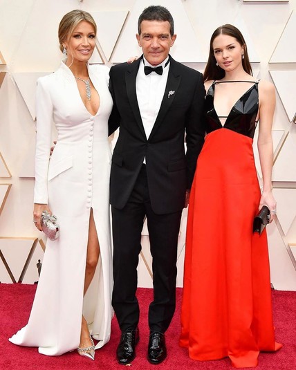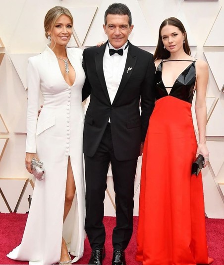Антонио Бандерас появился на красной дорожке в окружении близких людей. Актера сопровождала его возлюбленная — 38-летняя Николь Кимпел и дочь артиста, 23-летняя Стелла. Его возлюбленная не выпускала руку своего избранника. Кимпел стояла рядом с голливудским красавцем в ослепительно белом костюме на голое тело. В качестве модных аксессуаров блондинка выбрала серьги из белого золота и массивное колье.