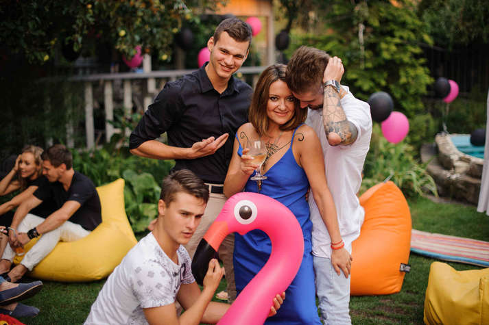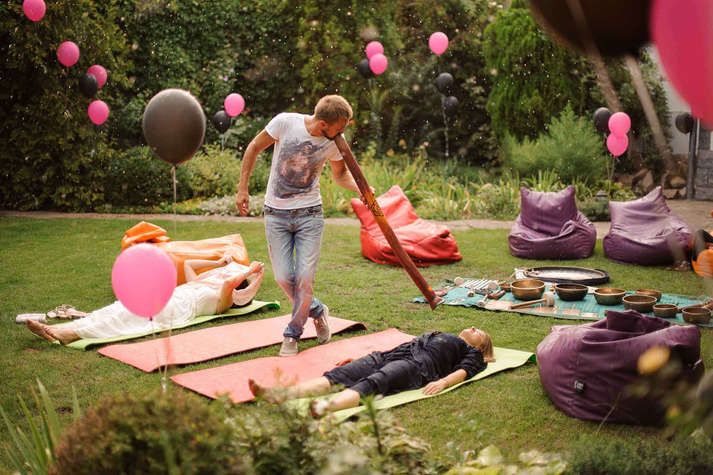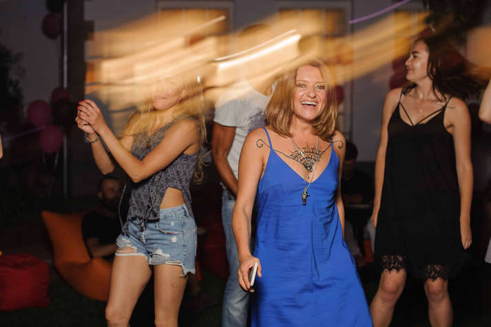 Вечеринка у бассейна превратилась в настоящее африканское веселье. Сначала гости погрузились в таинственное звучание тибетских чаш, гонгов и хангов, а потом, вместе с перкуссионистами «Осторожно! Звук», играли на африканских барабанах (специально для торжества их привезли более тридцати штук!). Двигать попами присутствующих «заставляла» известный хореограф, победительница «Танцы со Звездами» Алена Шоптенко, которая подарила Могилевской динамический мастер-класс по африканским танцам под барабанный грохот.