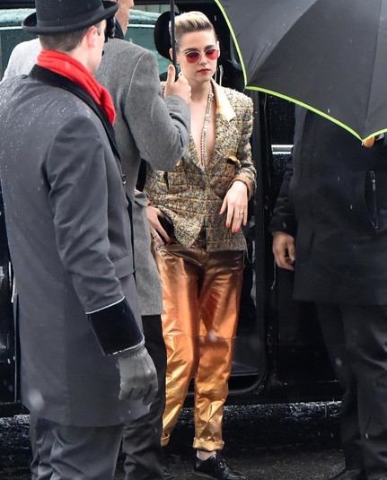 Звезда франшизы «Сумерки» появилась на Неделе высокой моды в строгом твидовом пиджаке с «бронзовыми» вставками и брюках такого же цвета металлик