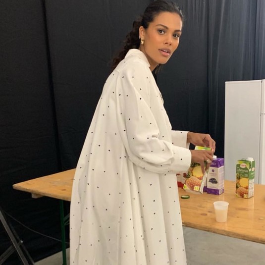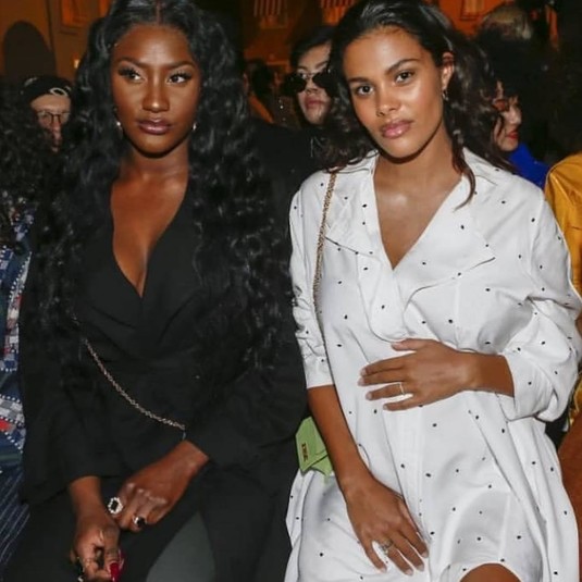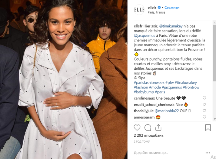 21-летняя модель и Тина Кунаки приехала в Париж, где посетила модный показ Jacquemus. Примечательно, что на этот раз компанию девушке составлял не муж, а ее брат Закари и певица Айя Накамура. Для выхода в свет модель выбрала белое легкое платье в горошек, которое подчеркнуло ее округлившийся живот.