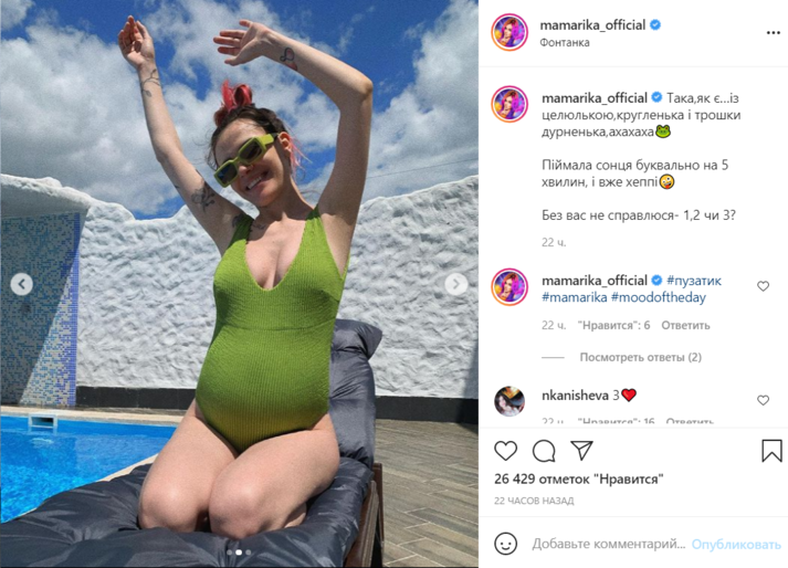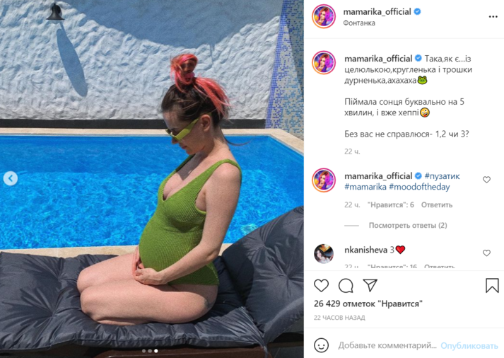 Известная украинская певица MamaRika, которая беременная первенцем, показала, как отдыхала у бассейна у себя дома.