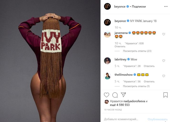 Артистка предпочла оригинальную прическу – заплела дреды. На волосах красовалось название ее модного бренда – Ivy Park. Это название звезда выбрала в честь семилетней дочери – Блюа Айви, а также своего детского пристанища, парка Парквуд.