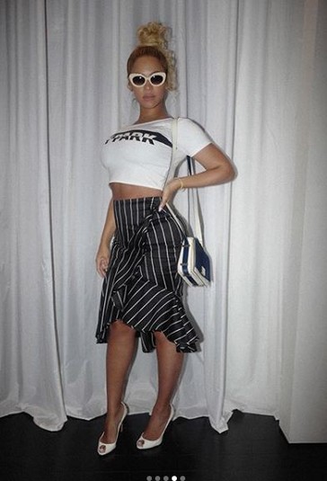 Футболку Бейонсе надела в сочетании с асимметричной юбкой в полоску, которая подчеркнула ее подтянутые бедра. Свой образ она дополнила ретро солнцезащитными очками в белой оправе, туфлями такого же цвета и небольшой сумкой на длинном ремешке, пишет журнал Grazia. Реакция поклонников не удивляет — комментарии пестрят комплиментами в адрес фигуры и стиля Бейонсе, а количество отметок «нравится» достигло полутора миллионов. Ждем, когда молодая мама покорит нас очередным интересным образом.