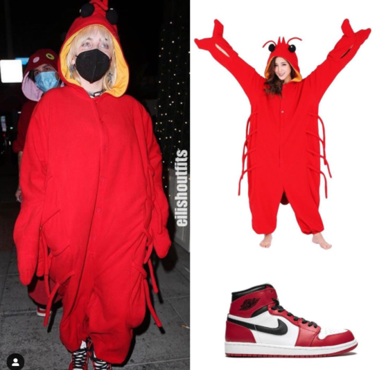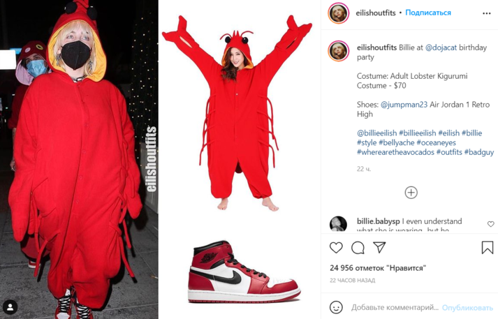 Американская поп-звезда Билли Айлиш посетила костюмированную вечеринку в честь 26-го дня рождения рэперши Амалы Дламини, более известной как Doja Cat, которая состоялась в Лос-Анджелесе. Знаменитость отказалась от сексуальных вещей в пользу оверсайз-одежды: папарацци запечатлели ее на публике в ярко-красном костюме лобстера и кроссовках Nike.