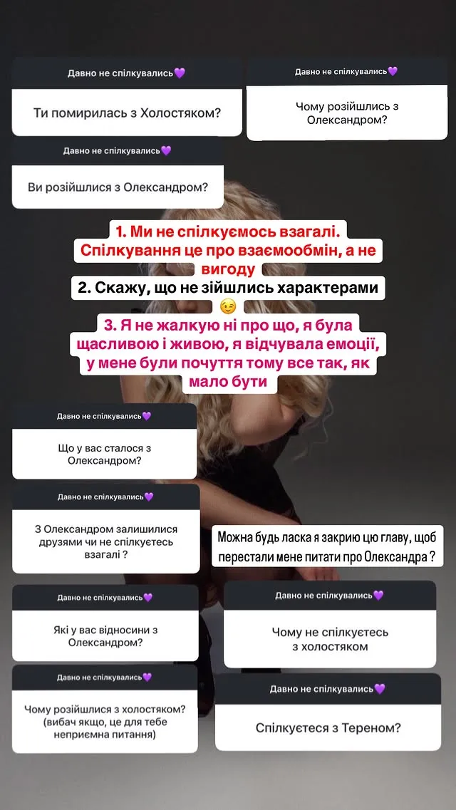 «Ми не спілкуємось взагалі. Спілкування це про взаємообмін, а не вигоду. Скажу, що не зійшлись характерами. Я не жалкую ні про що, я була щасливою і живою, я відчувала емоції, у мене були почуття тому все так, як мало бути», – сказала Інна Бєлєнь.