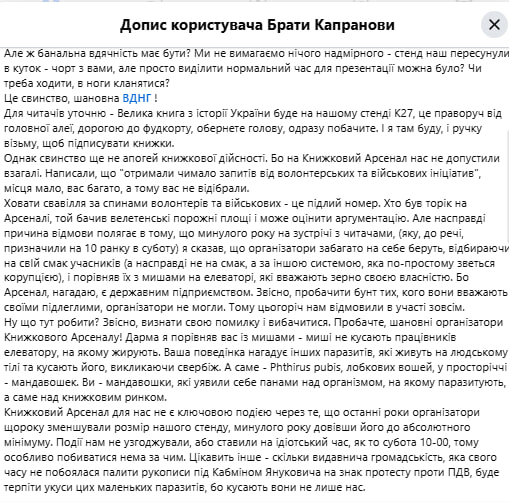 «Але насправді причина відмови полягає в тому, що минулого року на зустрічі із читачами (яку, до речі, призначили на 10 ранку в суботу) я сказав, що організатори забагато на себе беруть, відбираючи на свій смак учасників (а насправді не на смак, а за іншою системою, яка по-простому зветься корупцією), і порівняв їх із мишами на елеваторі, які вважають зерно своєю власністю», – пояснив автор допису. До слова, Капранов зауважив, що останні роки організатори подібних заходів щороку зменшували розмір його стенда, торік довівши його до мінімуму.
