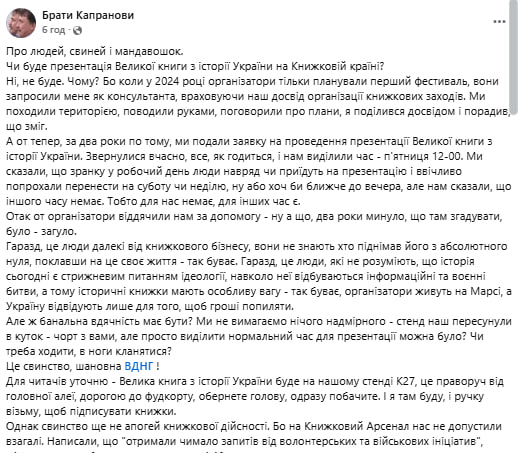 Як пояснив Капранов, презентація «Великої книги з історії України» на «Книжковій країні» мала б відбутися 24 квітня. Однак між ним та організаторами виникло непорозуміння. За словами письменника, йому виділили час та місце на ВДНГ у п’ятницю о 12 годині дня. Однак Капранов попросив про перенесення часу, адже посеред робочого дня навряд чи прийде багато відвідувачів.