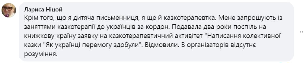 «Крім того, що я дитяча письменниця, я ще й казкотерапевтка. Мене запрошують із заняттями казкотерапії до українців за кордон. Подавала два роки поспіль на книжкову країну заявку на казкотерапевтичний активітет «Написання колективної казки» «Як українці перемогу здобули». Відмовили. В організаторів відсутнє розуміння», – написала Лариса Ніцой.