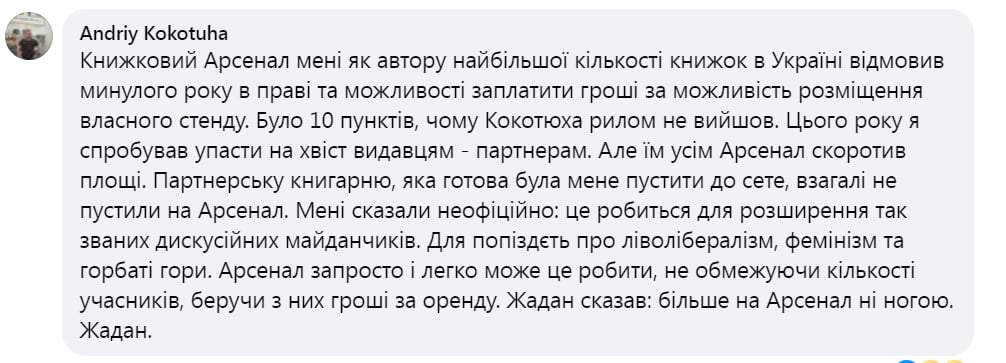«Книжковий Арсенал» мені як автору найбільшої кількості книжок в Україні відмовив минулого року в праві та можливості заплатити гроші за можливість розміщення власного стенду. Було 10 пунктів, чому Кокотюха рилом не вийшов. Цього року я спробував упасти на хвіст видавцям – партнерам. Але їм усім «Арсенал» скоротив площі. Партнерську книгарню, яка готова була мене пустити до себе, взагалі не пустили на «Арсенал». Мені сказали неофіційно: це робиться для розширення так званих дискусійних майданчиків. Для поп****ь про ліволібералізм, фемінізм та горбаті гори. «Арсенал» запросто і легко може це робити, не обмежуючи кількості учасників, беручи з них гроші за оренду. Жадан сказав: більше на Арсенал ні ногою. Жадан», – йдеться у коментарі.