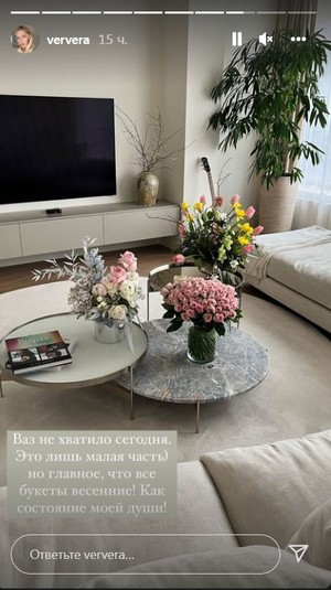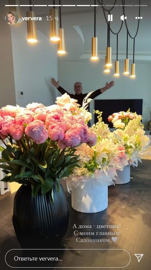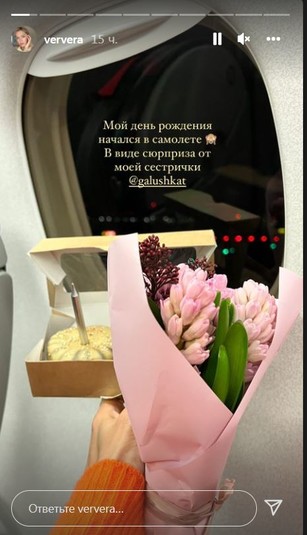 В сторис на своей странице в Инстаграм певица рассказала, как провела этот день. «Сажусь ночью в самолет и смотрю: какая-то девушка снимает меня на телефон. Я сначала возмущена, но она убирает телефон от лица и оказывается, что это моя сестра! – пишет певица. – Далее все было как в счастливом тумане. Для меня символично встречать день рождения в полете. Крылья, свобода и радость…» А тем временем, из дома певице прислал снимок с цветами ее супруг Константин Меладзе. Вера подписала фото: «А дома цветник с моим главным садовником. Ваз не хватило сегодня, но главное – все цветы весенние».