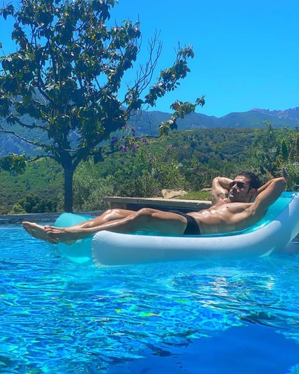 На размещенных кадрах знаменитость позирует в черно-белом бикини, лежа на надувном матрасе в бассейне на территории своего дома. Ее образ дополняют солнцезащитные очки.