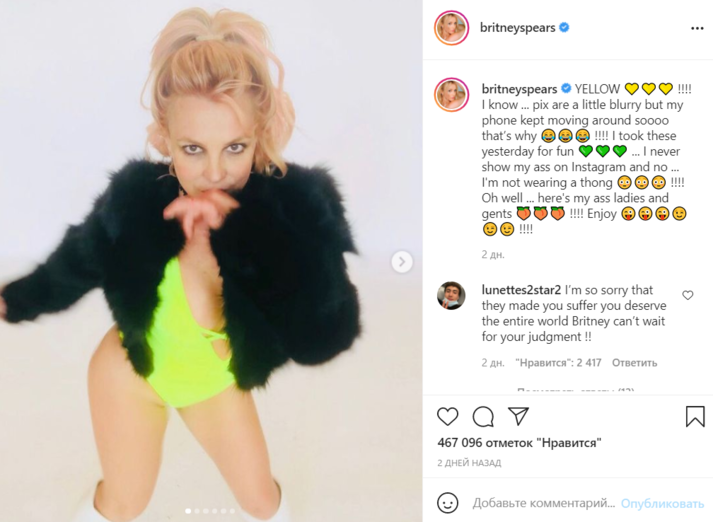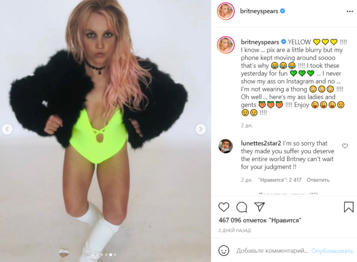Поклонники выразили беспокойство о Спирс. «Мне так жаль, что они заставили тебя страдать, ты заслуживаешь весь мир. Бритни, не могу дождаться твоей победы!», «Детка, это зеленый», «Мне нравится! Но это зеленый», «Выглядит, как скриншоты видео», «Какое тело!», «Крутой аутфит», «Самая горячая», «Ты используешь старый IPhone?», «Бритни, стой на своем! Правда на твоей стороне!», «Мы любим тебя», — писали фолловеры.