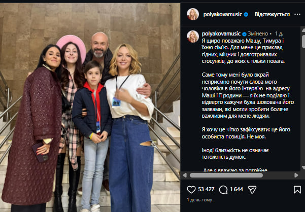 «Я щиро поважаю Машу, Тимура і їхню сім’ю. Для мене це приклад гідних, міцних і довготривалих стосунків, до яких є тільки повага. Саме тому мені було вкрай неприємно почути слова мого чоловіка в його інтерв’ю на адресу Маші і її родини – я їх не поділяю і відверто кажучи була шокована його заявами, які могли зробити боляче важливим для мене людям», – зазначила Полякова.