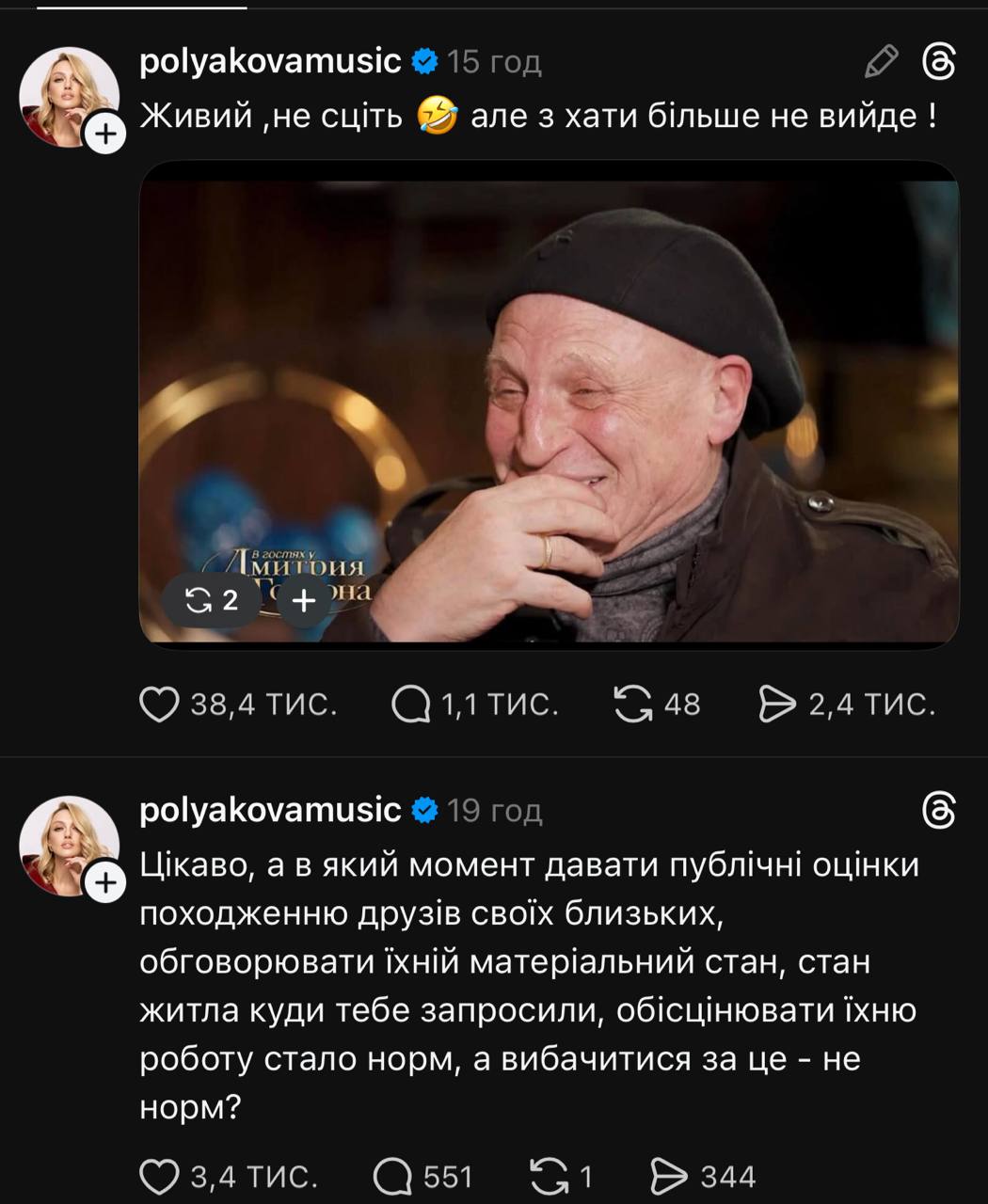 Крім цього, у соцмережі Threads Оля Полякова розкритикувала слова Вадима Буряковського. Напередодні, у ще одному дописі артистка жартома написала, що її чоловік живий, але з дому після свого інтерв’ю більше не вийде. «Цікаво, а в який момент давати публічні оцінки походженню друзів своїх близьких, обговорювати їхній матеріальний стан, стан житла, куди тебе запросили, обезцінювати їхню роботу стало норм, а вибачитися за це – не норм?» - написала артистка.
