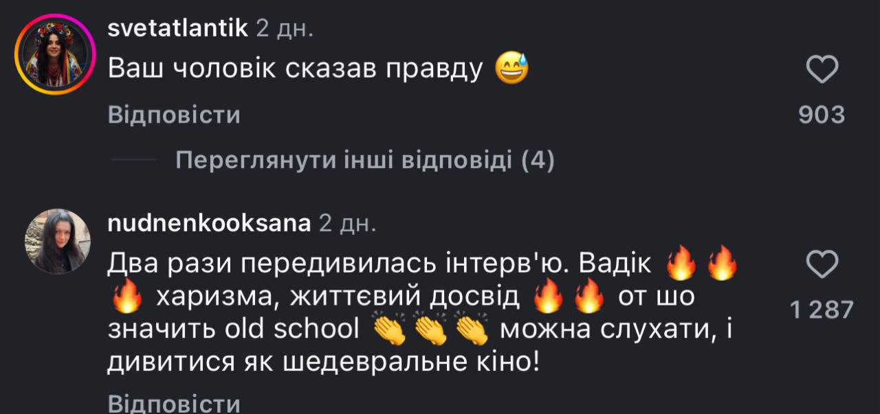 - «Дуже класне інтервʼю. Ще повчитись треба називати речі своїми іменами й не боятись що хто подумає».