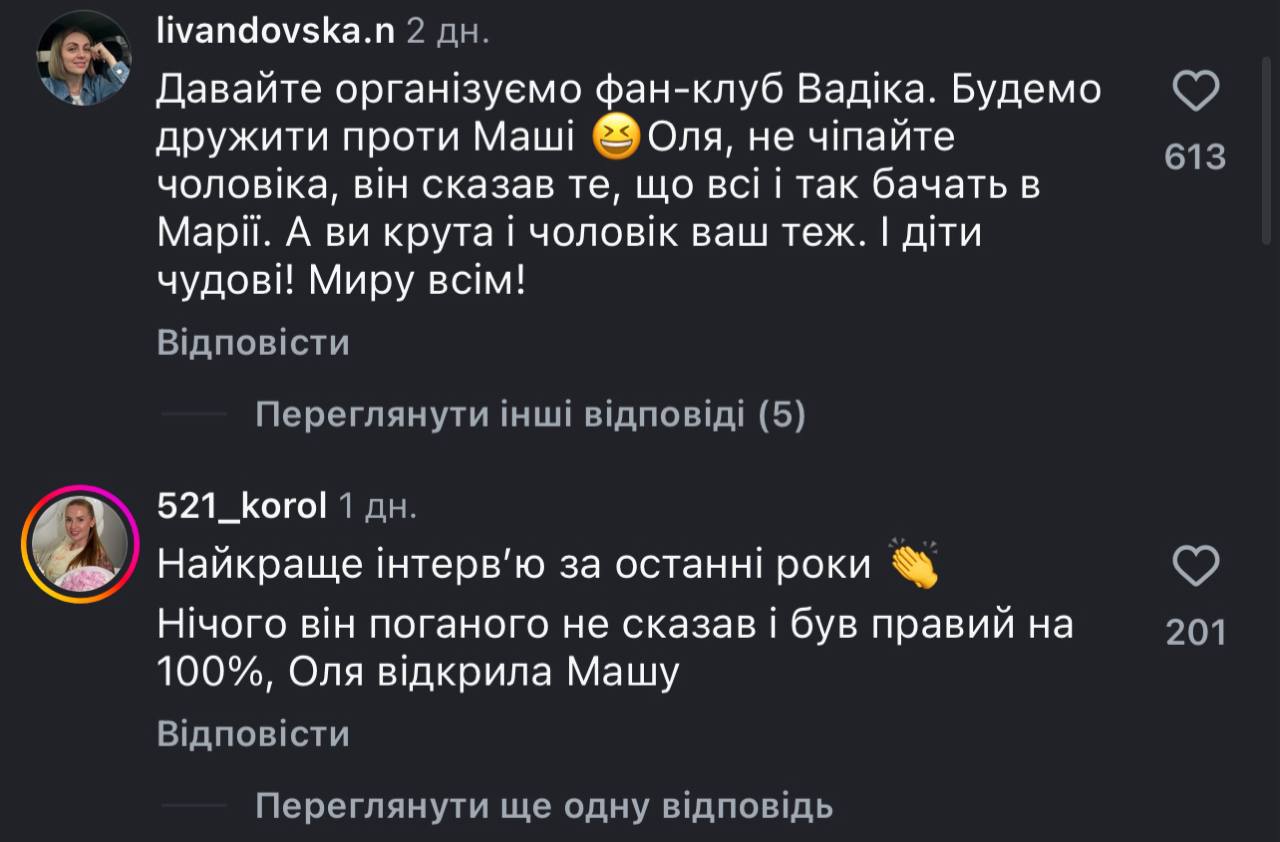 - «Найкраще інтервʼю за останні роки. Нічого він поганого не сказав і був правий на 100 %, Оля відкрила Машу».