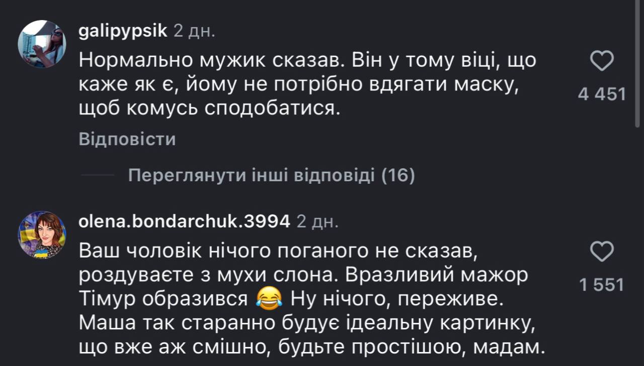 - «А чого Ваш чоловік має вибачатися за свою думку? Він сказав що думає і вкрай толерантно. Не пресуйте чоловіка».