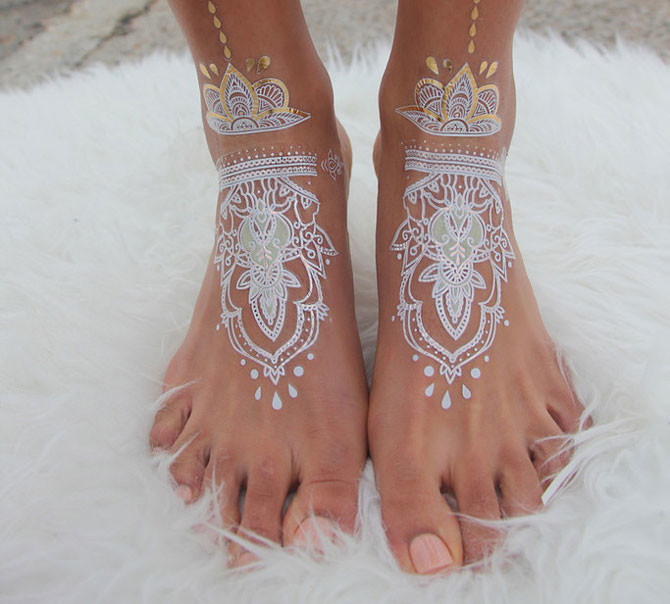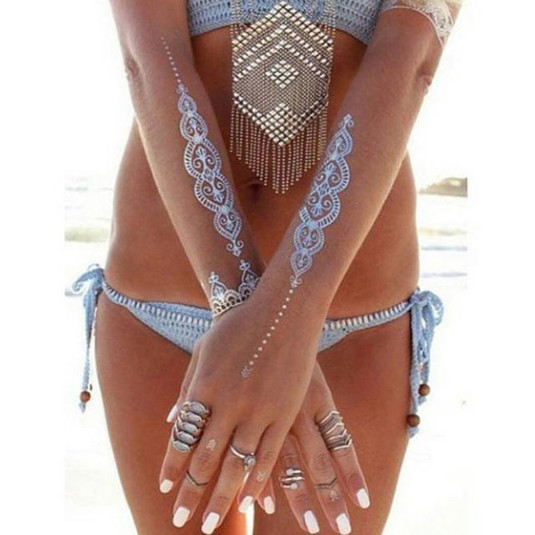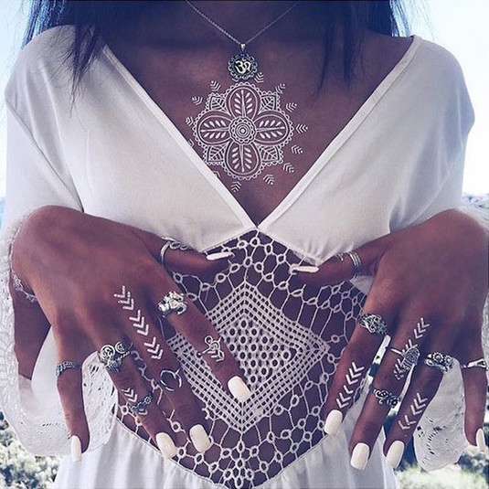 Это могут быть «металлические» наклейки, имитирующие кольца, браслеты и кулоны, это могут быть рисунки чёрной и рыжей хной.