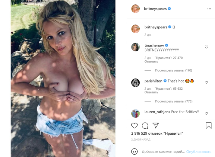 На размещенном в сети кадре 39-летняя знаменитость запечатлена на природе. Она одета в джинсовые шорты, оголяющие ноги. Грудь Спирс прикрывает руками. Публикация набрала более 1,7 миллиона лайков за семь часов.