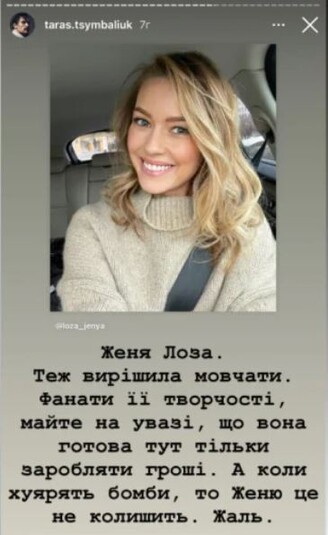 «Женя Лоза тоже решила молчать, – продолжает Цимбалюк. – Фанаты ее творчества, имейте ввиду, что она тут зарабатывает деньги, а когда ху#рять бомбы, ее не колышит».