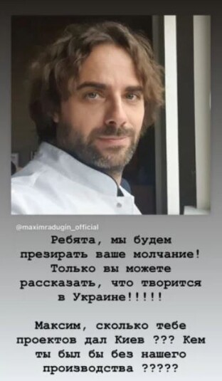 «Я могу еще десяток этих лгунов и ссыкунов выложить, но это не имеет смысла! Российские актеры, вы бл#ять очень подло молчите и мы вас не забудем! Вы мне рассказывали, что Киев вас сделал звездами! Теперь добро пожаловать в вечную очередь за Данилом Козловским, Сашем Палем, Буруновым и т.д. Х#й вам, а не Киев!» – написал актер.