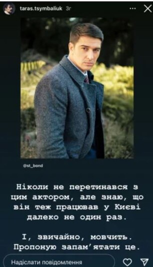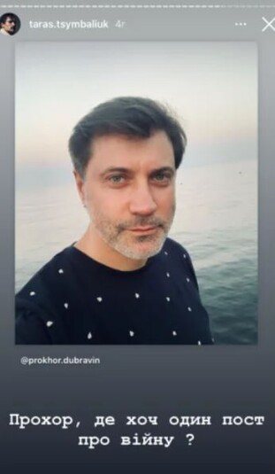 Звезда знаменитого сериала «Спіймати Кайдаша» в сторис своей инстаграм-страницы выставил фото российских актеров, которые до недавнего времени не вылезали из Украины, снимаясь в украинских сериалах. Некоторые из них – родились и выросли в Украине. Стас Бондаренко, о котором вспоминает Цимбалюк, из Днепрорудного Запорожской обрасти, а Евгения Лоза – из Антрацита Луганской области. Также Тарас Цымбалюк вспомнил Антона Батырева, Максима Радугина, Дмитрия Пчелу, Прохора Дубравина, Кирилла Жандарова, Станислава Бондаренко, Александра Ратникова, Михаила Гаврилова-Третякова и Кирилла Дыцевича.