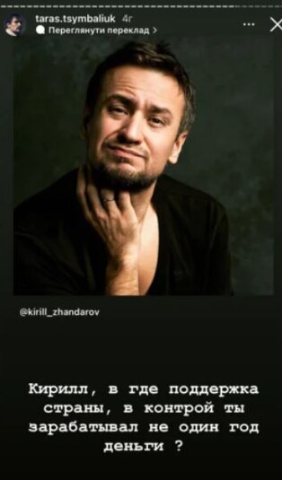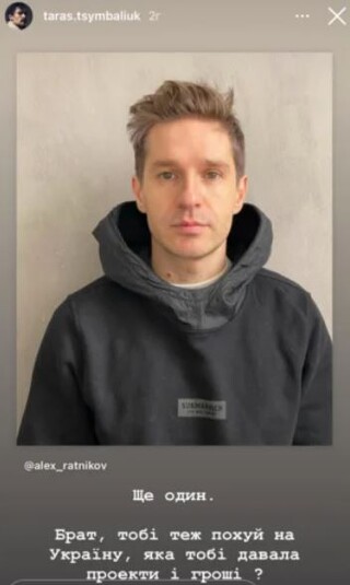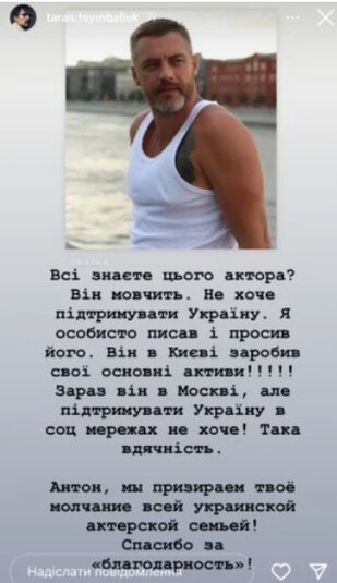 «Все знаете этого актера? Он молчит, – написал Тарас Цымбалюк об Антоне Батыреве. – Не хочет поддерживать Украину. Я лично писал и просил его. Он в Киеве заработал свои главные активы! Сейчас он в Москве, но поддерживать Украину в социальных сетях не хочет! Такова благодарность. Антон, мы презираем твое молчание всей украинской актерской семьей. Спасибо за «благодарность»
