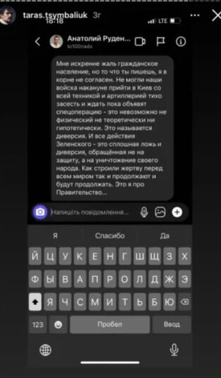 Тарас Цимбалюк написал, что Дмитрий Пчела заблокировал его в соцсети, а Анатолий Руденко написал, что ему «жаль гражданское население, но не могли наши войска накануне прийти в Киев, тихо засесть и ждать пока объявят спецоперации. Все действия Зеленского – это сплошная ложь и диверсия, обращенная не на защиту, а на уничтожение своего народа. Как строили жертву перед всем миром, так и продолжают. Это я о правительстве».
