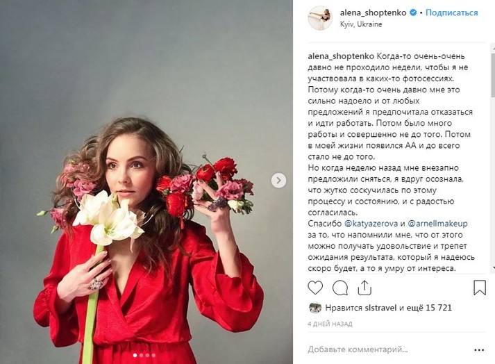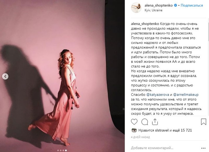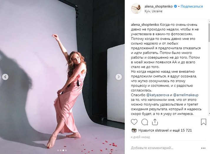 «Когда-то очень-очень давно не проходило недели, чтобы я не участвовала в каких-то фотосессиях. Потому когда-то очень давно мне это сильно надоело и от любых предложений я предпочитала отказаться и идти работать. Потом было много работы и совершенно не до того. Потом в моей жизни появился АА и до всего стало не до того. Но когда неделю назад мне внезапно предложили сняться, я вдруг осознала, что жутко соскучилась по этому процессу и состоянию, и с радостью согласилась», – написала Алена Шоптенко в соцсети.
