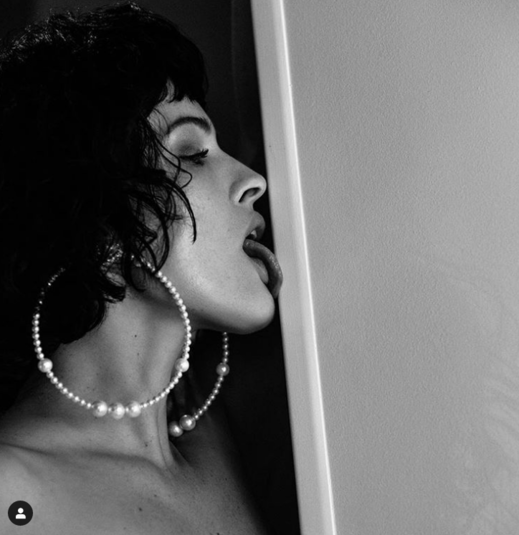 На одной фотографии Даша Астафьева в больших круглых серьгах высунув язычок соблазнительно облизывает стену.