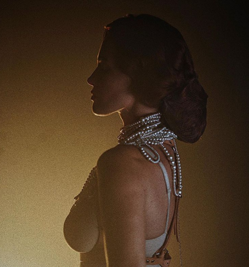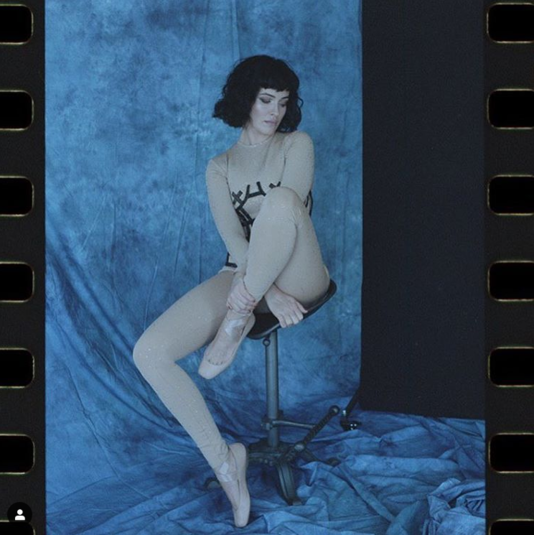 На втором фото Даша Астафьева в тех же круглых серьгах, колготах в сеточку и черном бархатном боди оголила свою пышную грудь, соски которой прикрывает лишь надпись «цензура».