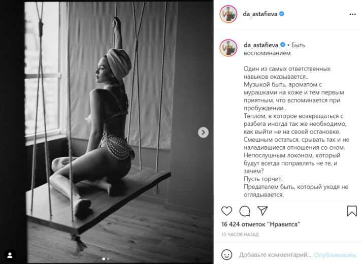 «Быть воспоминанием. Один из самых ответственных навыков оказывается… Музыкой быть, ароматом с мурашками на коже и тем первым приятным, что вспоминается при пробуждении. Теплом, в которое возвращаться с разбега иногда так же необходимо, как выйти не на своей остановке. Смешным остаться, срывать так и не наладившиеся отношения со сном…», - написала Даша.