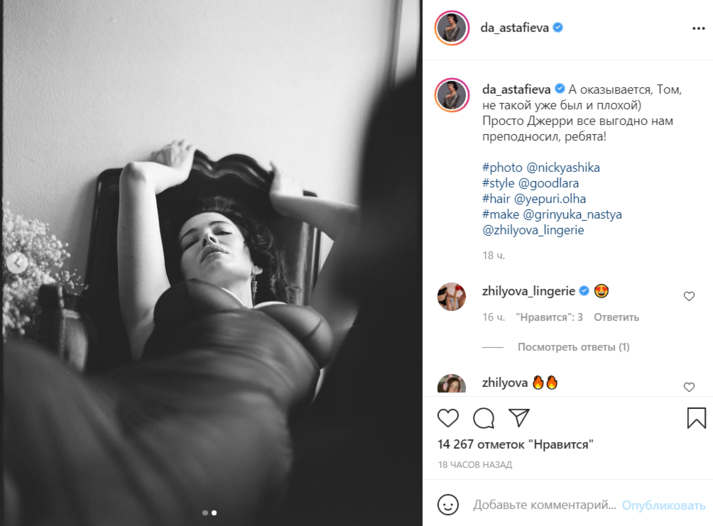Так, на странице в Instagram артистка запостила черно-белые фотографии, на которых томно позирует в прозрачной ночнушке. Такой наряд Астафьевой несколько засветил ее бюст и нижнее белье.