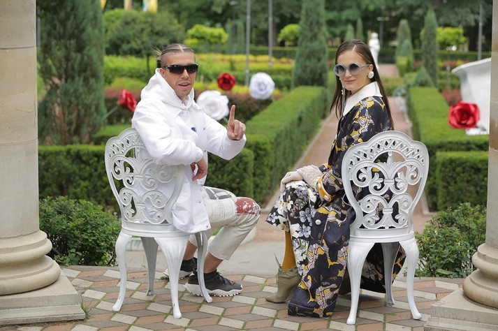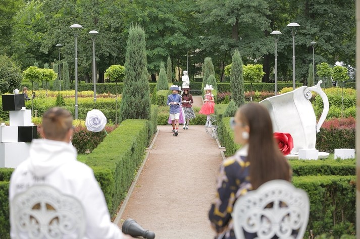 Дефилировали модели в сказочном саду, где посреди ухоженной зелени стараниями художников реалити Нового канала выросли гигантские розы и появились удивительные декорации: шахматные фигуры, античные скульптуры, бутафорские циферблаты. Подиум завершался у беседки, где на двух белоснежных креслах своих подопечных встречали Алла Костромичева и Костя Боровский.