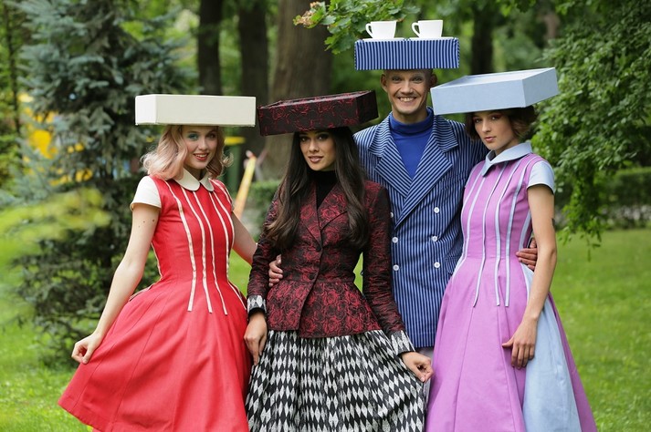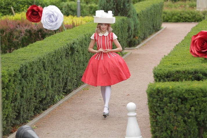 «У нас на головах вместо шляп – подносы-тумбочки. На них может поместиться целый чайный сервиз, – комментирует усложнение задания Катя Польченко. – Раз споткнешься, и дефиле завалено. Но у меня есть план Б! В кустах припрятала запасной комплект посуды. Если что-то пойдет не так, смогу быстро поправить образ. Я хоть и самая мелкая из всех, но самая хитрая!»