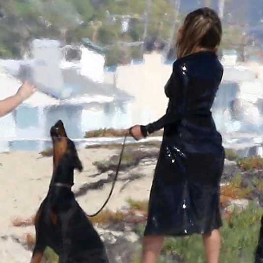 Образ Джен дополнили очки-авиаторы, серебристые лодочки и небрежная укладка - прямые волосы, развевающиеся на ветру. Партнером по съемке Энистон стал большой черный доберман, но он в кадр, к сожалению, не попал.